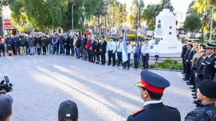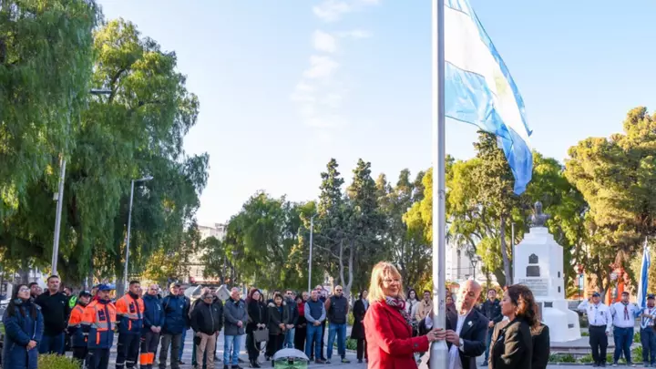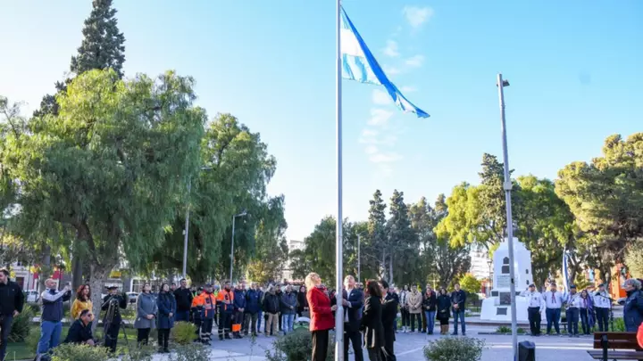 El intendente de la localidad portuaria, Gustavo Sastre, estuvo en el izamiento de la bandera en el Pabellón Nacional en la plaza San Martín en este día patrio.