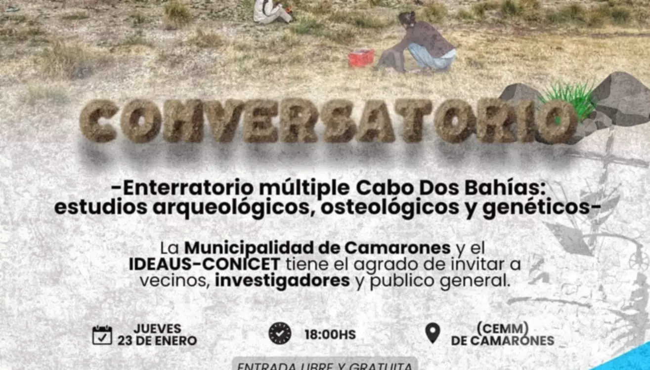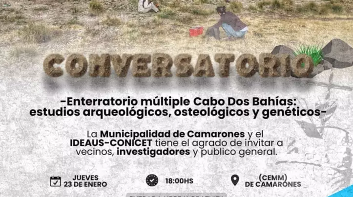 La Municipalidad de Camarones y el IDEAUS-CONICET, con el acompañamiento de la Subsecretaría de Cultura de la Provincia del Chubut, invitan a vecinos, investigadores y público interesado a participar del conversatorio titulado "Descubriendo el pasado humano en Cabo Dos Bahías: hallazgos arqueológicos, osteológicos y genéticos", que se realizará el próximo jueves 23 de enero a las 18:00 horas en el Centro Multiespacio Municipal (CEMM) de Camarones.