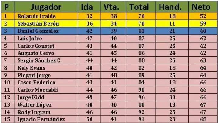 El último campeón Roly Iralde, dando muestras que para nada se ha relajado fue el ganador de la primera fecha con un total de 52 golpes netos, relegando al segundo puesto a otro gran animador que tiene la actividad golfista capitalina, como es Sebastián Berón que totalizó 59 goles netos y tercero, completando un imaginario podio Daniel González con 60 golpes.