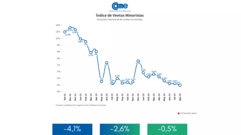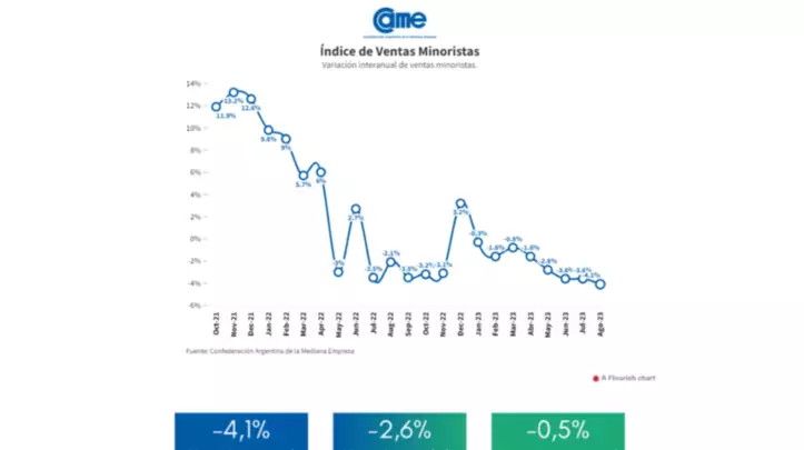Así surge del Índice de Ventas Minoristas Pymes de la Confederación Argentina de la Mediana Empresa (CAME), elaborado en base a un relevamiento mensual entre 1.252 comercios minoristas del país, realizado del 4 al 8 de septiembre.