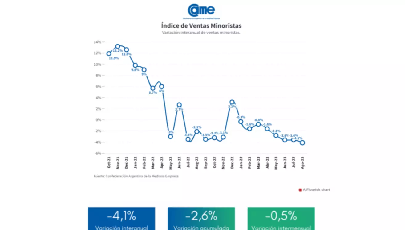 Las ventas minoristas de las pequeñas y medianas empresas registraron una disminución del 4,1% en agosto en comparación con el mismo período del año pasado. Este descenso representa una tendencia preocupante, ya que se prolonga por ocho meses consecutivos. Además, en el acumulado de enero a agosto se observó una caída interanual del 2,6%. En términos mensuales, las ventas también se contrajeron un 0,5% en relación a julio.