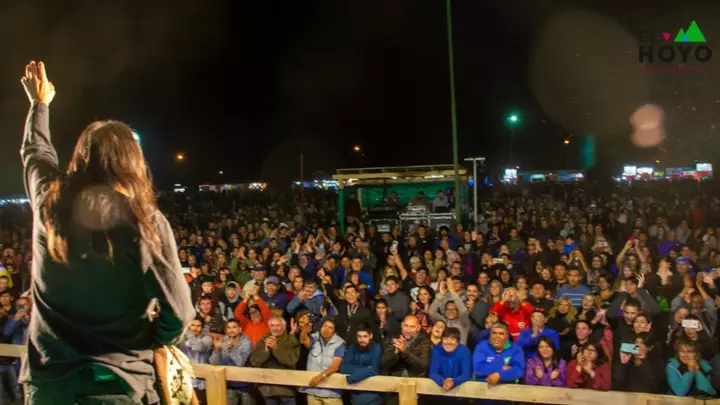 Patagonia invitó unos minutos al escenario a Soraya Malcoño, y juntos proclamaron el rechazo de los pueblos a la minería en el territorio chubutense.