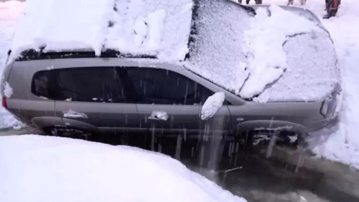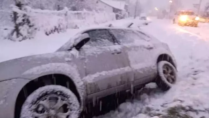 En medio del fuerte temporal de nieve registrado ayer, una camioneta en la que se movilizaban dos turistas cayó a un canal pluvial en Trevelin y tuvieron que ser auxiliados por vecinos del lugar.