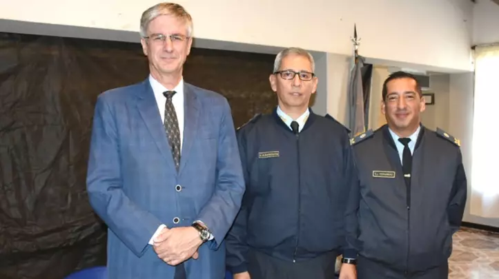 El intendente Ongarato junto al Director General de Administración del Servicio Penitenciario Federal, Inspector General Víctor Ñancuan y el nuevo jefe de la Cárcel de Esquel, Subprefecto Dimas Javier Fernández.