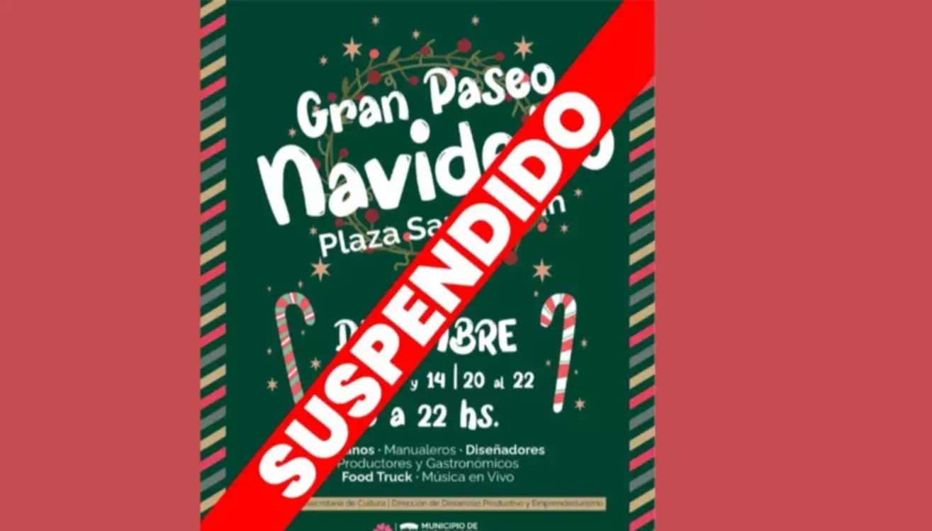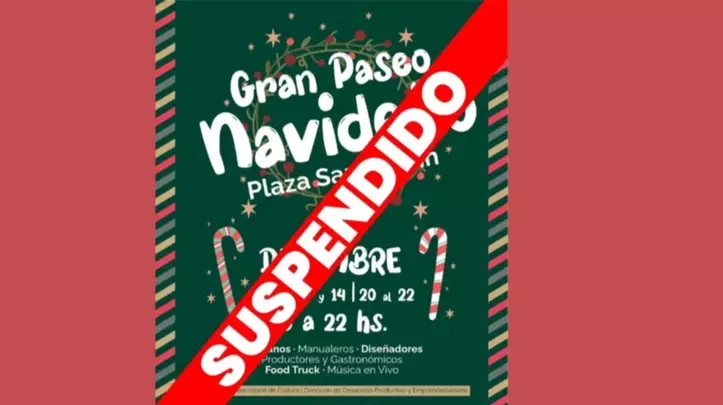 La Municipalidad de Esquel informa que el Paseo Navideño previsto para este fin de semana, 13 y 14 de diciembre, en Plaza San Martín, queda suspendido debido a la alerta amarilla por vientos y probabilidad de lluvias emitida por el Servicio Meteorológico Nacional.