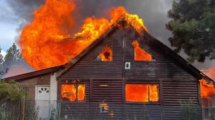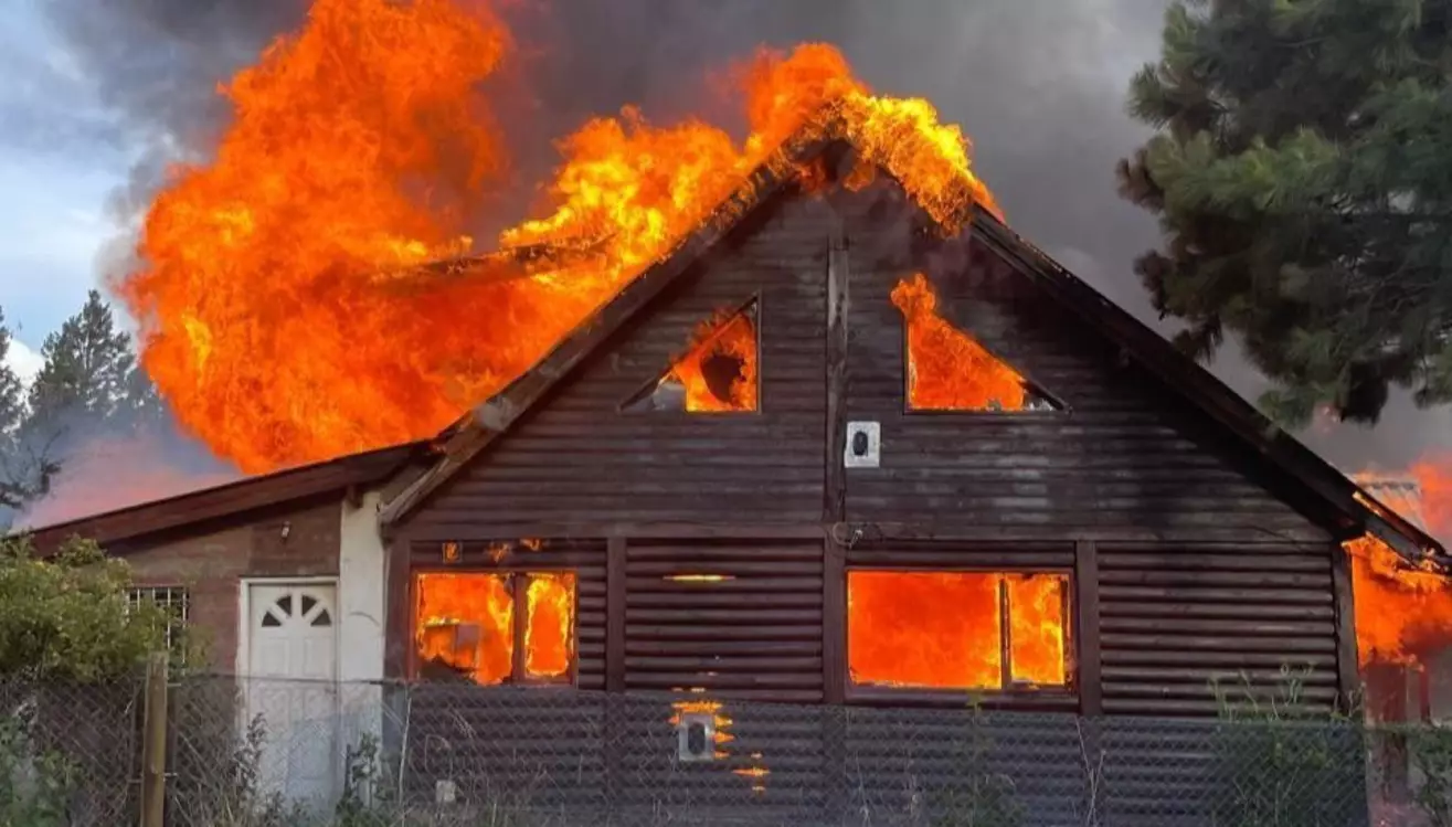 La vivienda tipo cabaña construida en gran parte de madera fue consumida rápidamente por el fuego a pesar de la rápida intervención de los bomberos de la localidad.