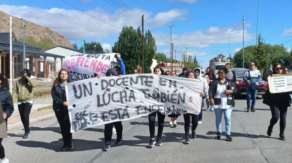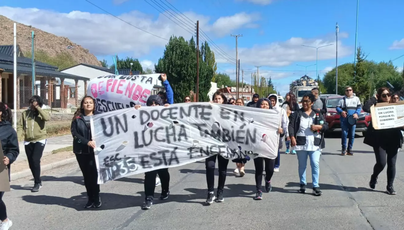 Los trabajadores recorrieron la arteria principal de Gobernador Costa y también fueron a la radio local para explicar a la comunidad los motivos de paro y movilización en lo que fue el primer día de clases en Chubut.