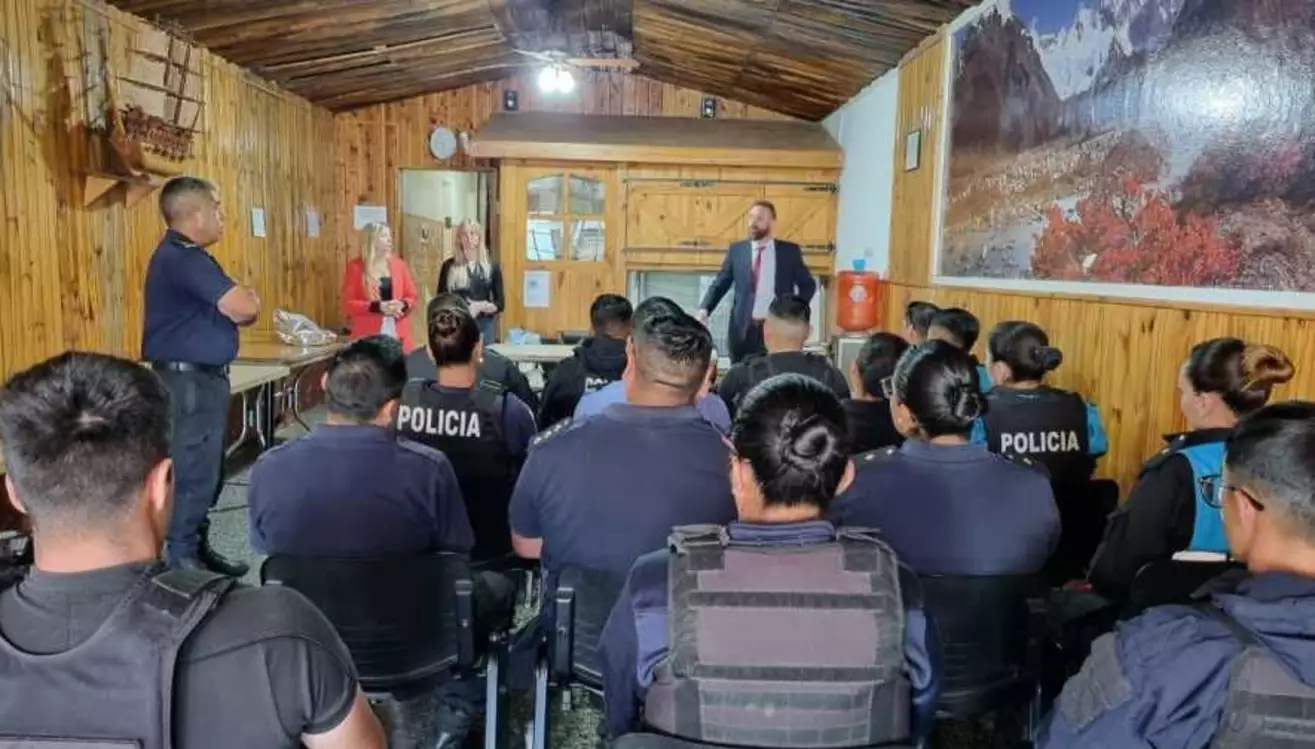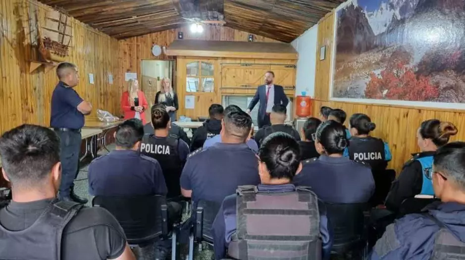 El fiscal general Martin Robertson, junto a la funcionaria Paula Bestene, la abogada de Fiscalía Lucía Estuardo y la comunicadora institucional Sonia Vaamonde, se reunieron con el Ministro de Seguridad y Justicia, Héctor Iturrioz, el Jefe de la URE Comisario Inspector Hugo Melipil, comisarios y oficiales de las comisarías de Esquel y Trevelin.