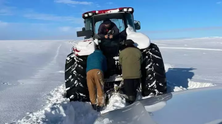 A Fernando le llevó siete horas unir en tractor los 22 kilómetros que separan la ruta provincial 61 con el casco de la estancia Ketenk Aike, ubicada a 80 kilómetros de Río Turbio, en la zona de Fuentes del Coyle, una de las áreas que más precipitaciones níveas recibió en el último mes. Solo con un tractor abriendo camino y dos camionetas pudo llegar para encontrarse con los puesteros del campo. “Las ovejas aún pueden resistir unos días más, todo dependerá de cómo siga el clima”, aseguró el productor.