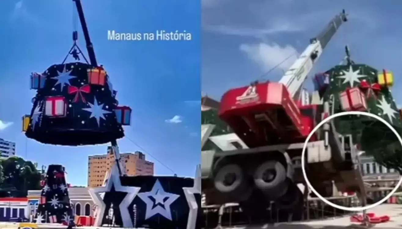 Un video en redes sociales muestra el momento exacto en que el vehículo, mientras intentaba colocar la parte de abajo de un gigante árbol navideño, cede y vuelca. Además, se ve que otra persona, disfrazada de Papa Noel, sale disparado de la grúa para evitar lastimarse.