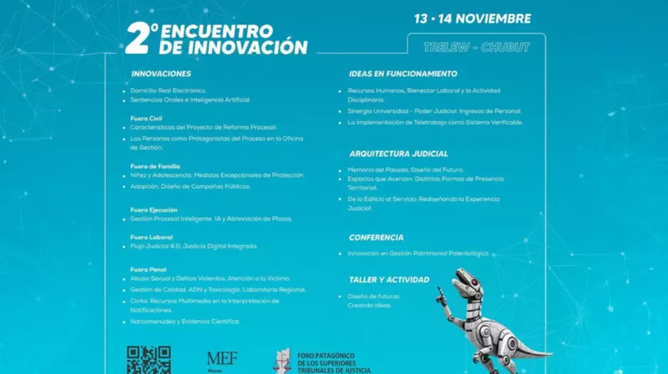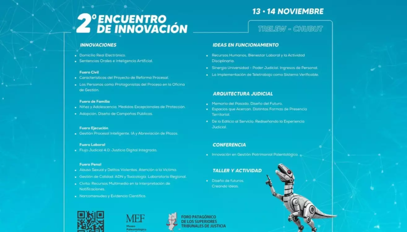 Las actividades tendrán como sede el Museo Paleontológico "Egidio Feruglio" (MEF) de Trelew y reunirá a representantes de los Poderes Judiciales de las provincias patagónicas, nucleadas en el Foro Patagónico de los Superiores Tribunales de Justicia.