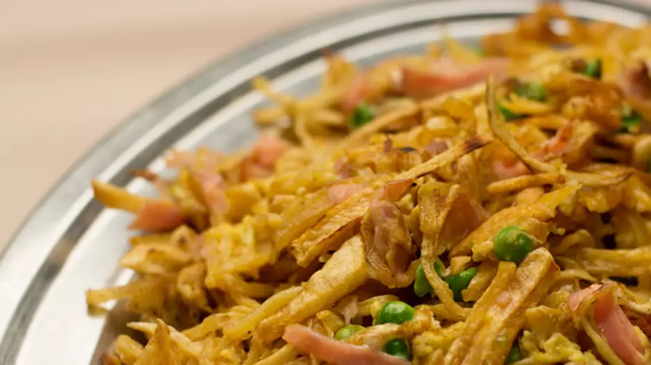 Papa 500gr.; Huevos 4; Jamón cocido 100gr.; Aceite para freír, cantidad necesaria; Arvejas 50gr.; Cebolla 100gr.; Manteca, Sal y Pimienta, cantidad necesaria.