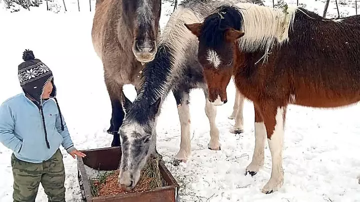 Por su parte, en el establecimiento "Los Alazanes" de Gan Gan la familia Marín salió a camperear y pese a las dificultades generadas por la nieve pudieron alimentar al ganado.