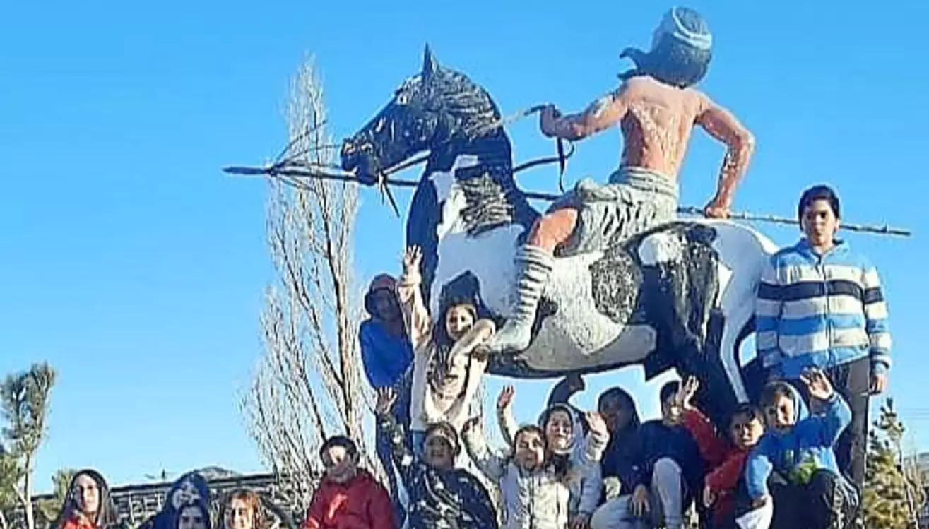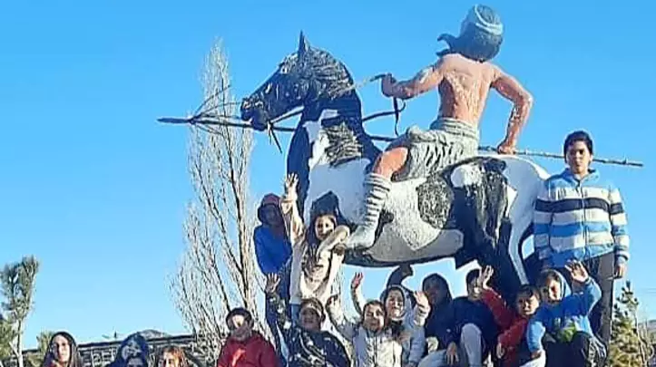 Es así como un grupo de niños y niñas de Buen Pasto, poblado situado a 90 kilómetros de Sarmiento, se dirigieron hasta Aldea Apeleg para acompañar y celebrar su día, y posaron para la posteridad en uno de los monumentos que tiene Apeleg en la plaza principal.