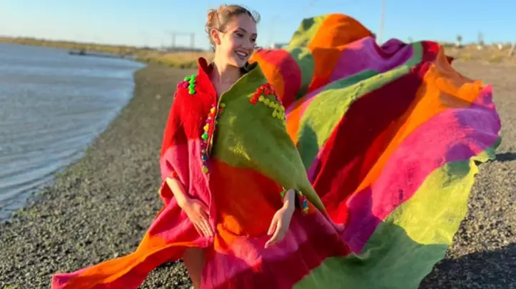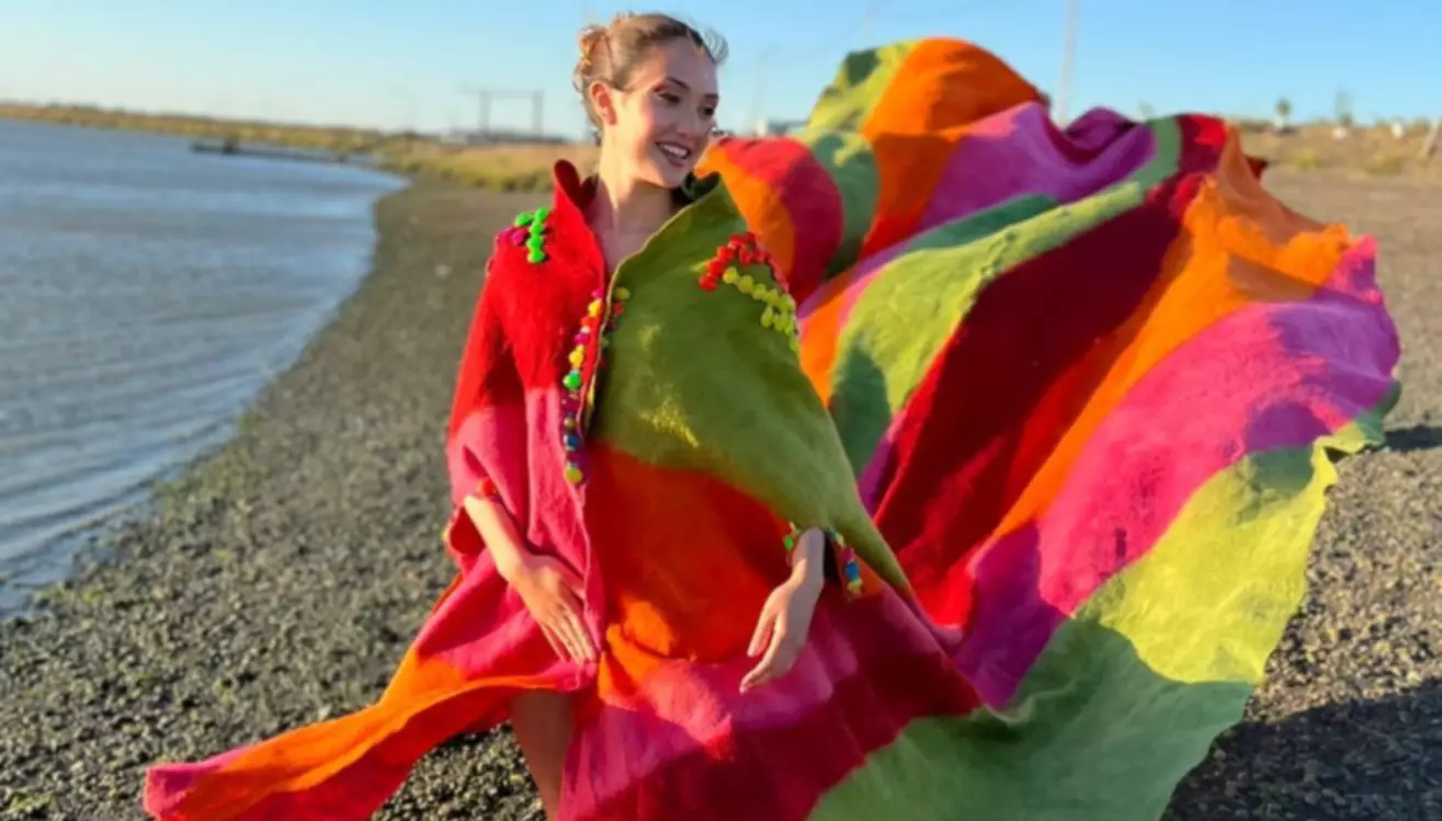 El conjunto inspirado en el viento patagónico, muetra la capa de fieltro de Julia Rossi, de El Hoyo, complementando la falda con vuelo, creada en fieltro de lana merino por el emprendimiento Fieltro Patagónico de Esquel.