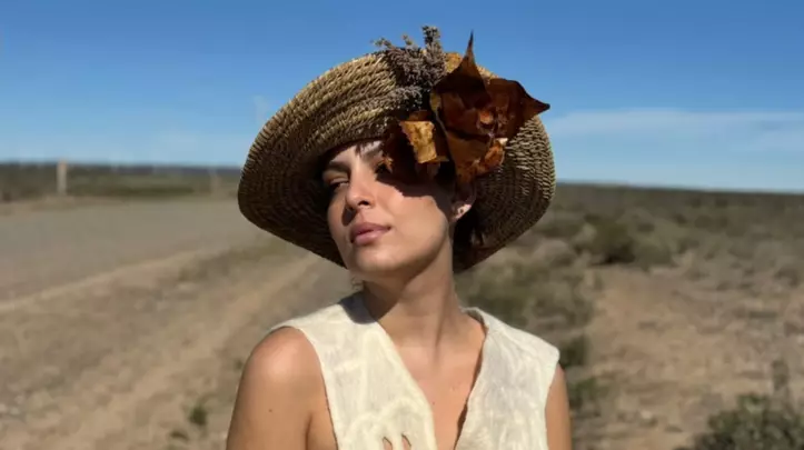 Conjunto realizado por Julia Rossi. Chaqueta de lana cruda calada a mano y pollera de fieltro “nuno” con lana merino sobre gasa de algodón, Capelina de pinocha tejida por Alejandra Caporale y bouquet de hojas de álamo y lavanda. Sobre de cuero de pescado (pejerrey, perca y trucha arcoíris) de Alicia Guzman, cosido con lana merino teñida con tintes naturales de Sulupe, manteniendo formas orgánicas.