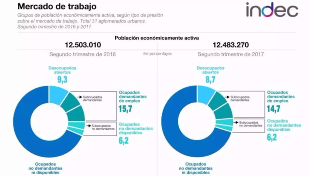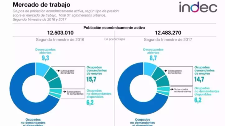 El Índice de Desocupación se ubicó en el 8,7% al término del segundo trimestre del año, seis décimas por debajo del 9,3% registrado en igual período de 2016, informó hoy el Instituto Nacional de Estadística y Censos (Indec).