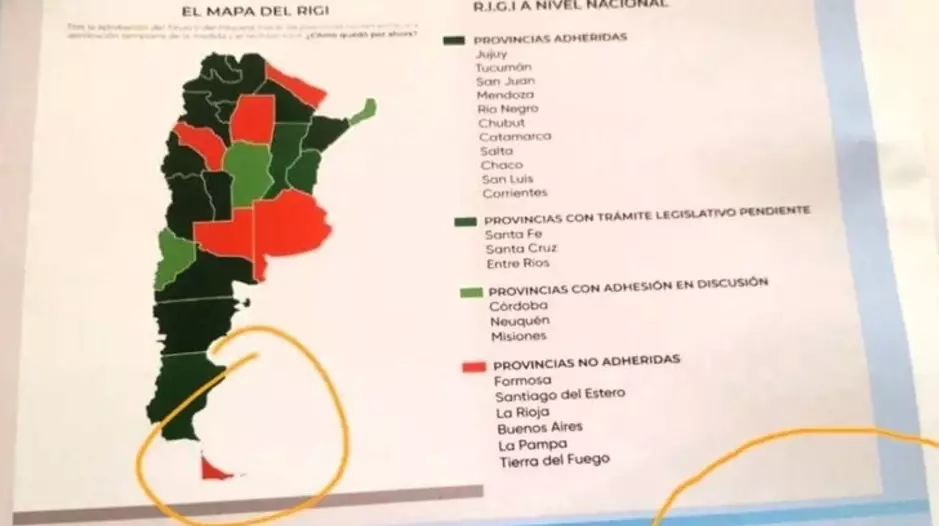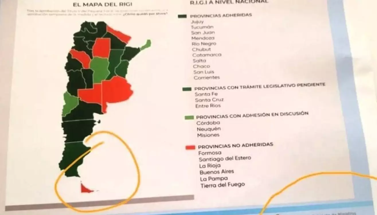 El mapa mostraba con distintos colores las provincias que ya adhirieron al régimen de inversiones impulsado por Javier Milei, como son Jujuy, Tucumán, San Juan, Mendoza, Río Negro, Chubut, Catamarca, Salta, Chaco, San Luis y Corrientes. Luego, aquellas que están en negociaciones, como Santa Fe, Santa Cruz y Entre Ríos; también las que aún discuten la adhesión, como es el caso de Córdoba, Neuquén y Misiones. Por último, las que lo rechazaron, como Buenos Aires, Formosa, Santiago del Estero, La Rioja, La Pampa y Tierra del Fuego.