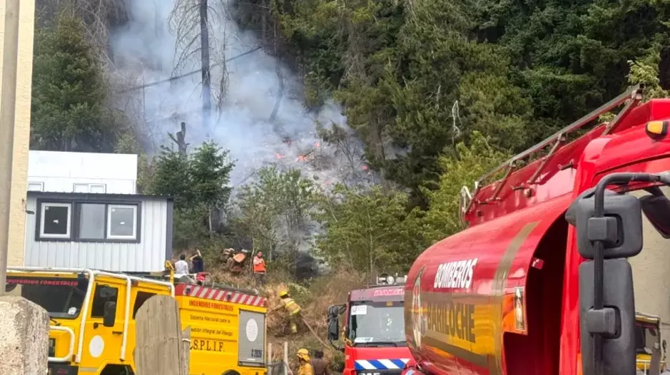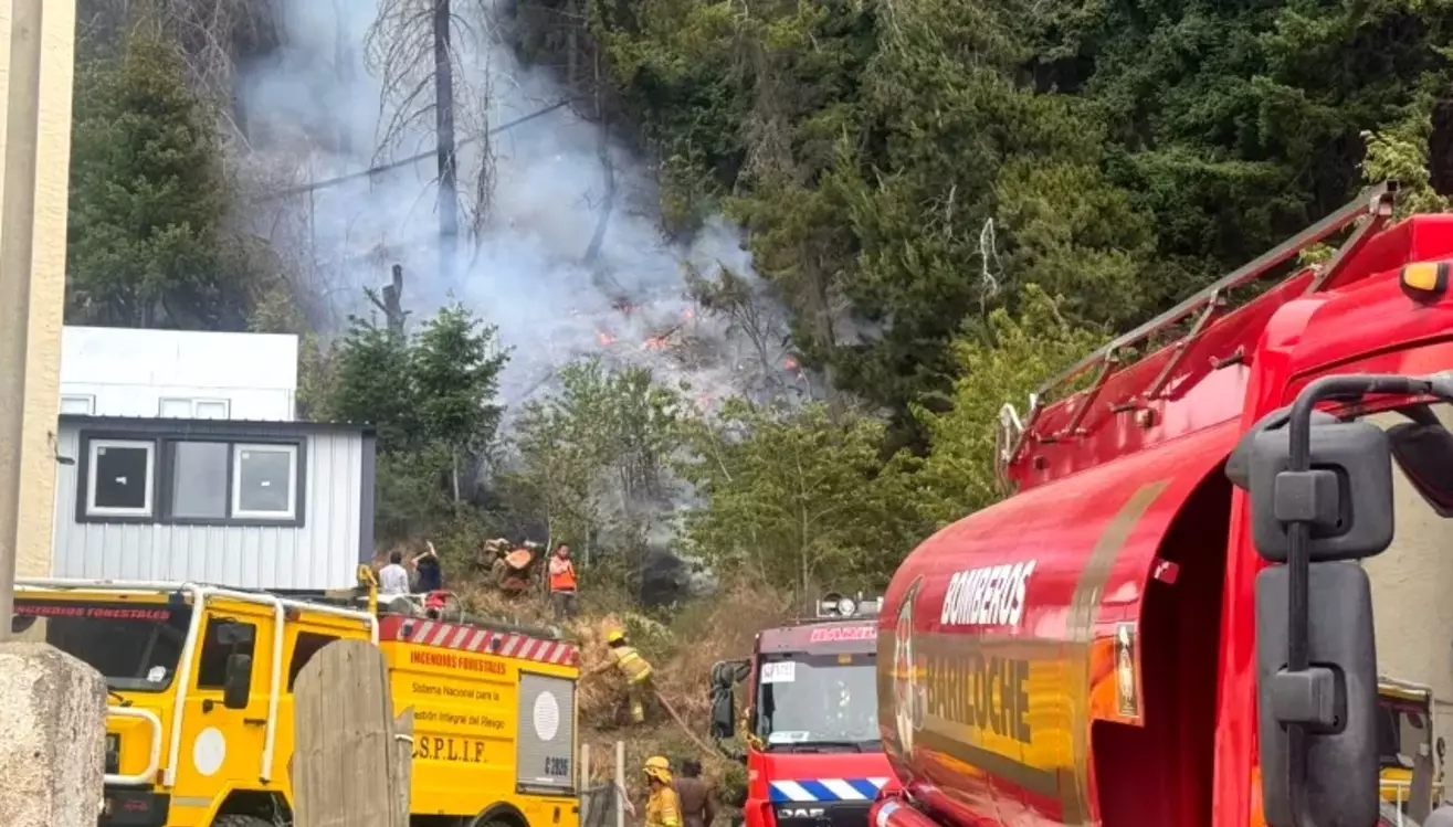 Un incendio se desarrolla cerca del Sanatorio San Carlos, en la ciudad rionegrina de Bariloche, y Bomberos Voluntarios del Cuartel Centro luchan para apagar las llamas.