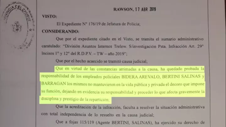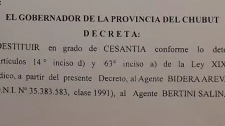 En una parte de la resolución firmada por el gobernador Mariano Arcioni se destaca que los mismos “no mantuvieron en la vida pública y privada el decoro que impone su función dejando en evidencia su responsabilidad y proceder que afectan gravemente la disciplina y prestigio de la repartición”.