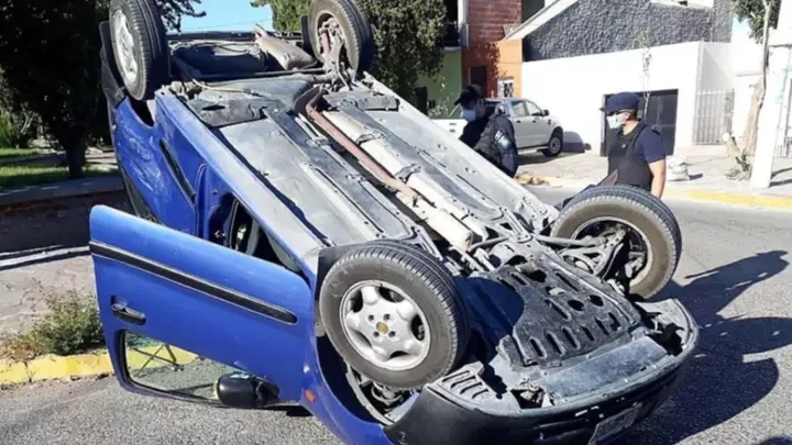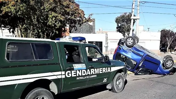 Un móvil de Gendarmería Nacional chocó con un utilitario y lo hizo volcar en una esquina del radio urbano de Trelew. A causa del espectacular accidente el conductor del vehículo que quedó en posición invertida fue trasladado al hospital. Después la Policía dijo que había sufrido lesiones de carácter leve.