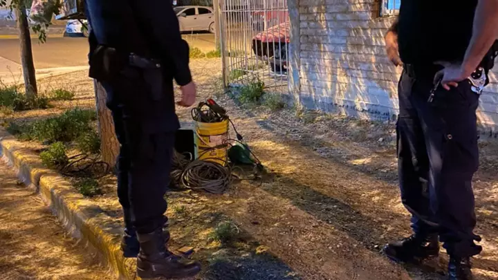 Se realizó un rastrillaje en la zona y los efectivos policiales notaron que en la esquina de las calles Pujo y Roberto Gómez, se encontró un microondas, un balde con varios cables en su interior, un taladro, una moladora, una cierra y un arnés de seguridad. Todos los elementos estaban atados con un nuevo en medio.
