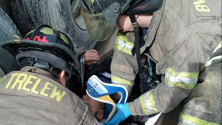 Un joven en moto se estrelló contra el acoplado de un camión y al rebotar contra las duales se salvó de milagro de que no le pasaran por encima. Se fracturó una de sus extremidades inferiores y ya le dieron el alta. El accidente ocurrió ayer en el ingreso a una estación de servicio del acceso norte de Trelew.