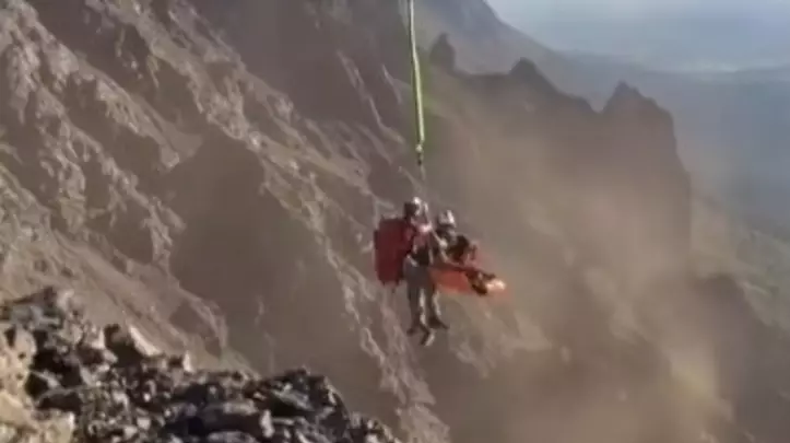 Para la evacuación se convocó a un helicóptero de una empresa privada de Bariloche, que dejó a los rescatistas en las inmediaciones y luego extrajo al deportista mediante una maniobra de alta complejidad: suspendido de una linga a varios metros de altura.