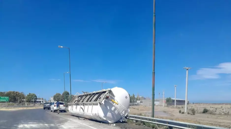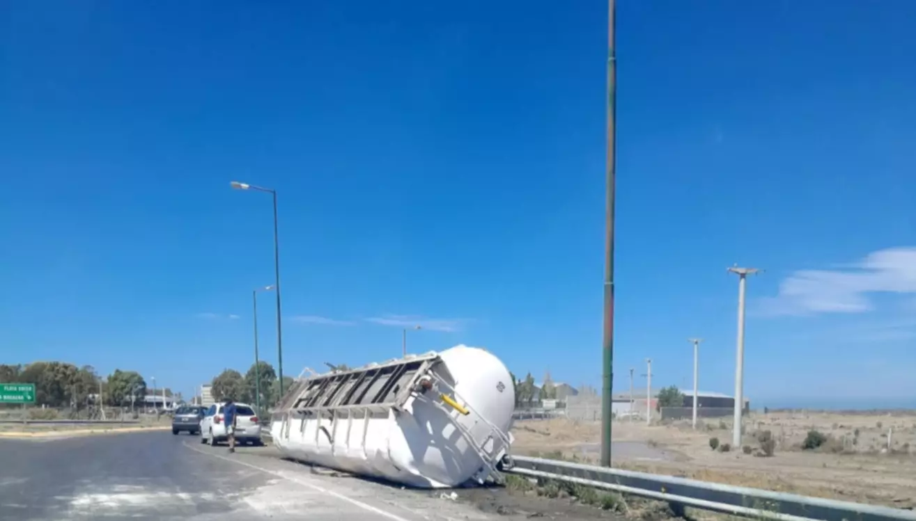 El hecho ocurrió alrededor de las 13.40 horas, mientras el vehículo realizaba un viaje para una empresa pesquera que opera en el ámbito local. El camión circulaba con la cisterna cargada en su totalidad con agua y, por causas que se investigan, el semi se dio vuelta, provocando que el tanque quedara apoyado sobre el guardarrail.