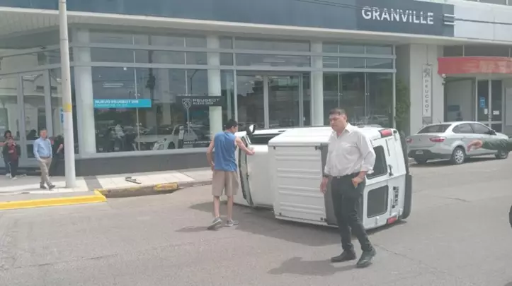 Dos vehículos chocaron en una céntrica esquina de Trelew y uno de ellos volcó, en un incidente de espectaculares características en el que nadie salió herido. El hecho se registró cerca de las 14 horas en la intersección de Belgrano y avenida 9 de Julio al momento en que colisionaron un Volkswagen Gol, conducido por su propietario de 38 años, y una furgoneta Fiat Fiorino al mando de un hombre de 49.
