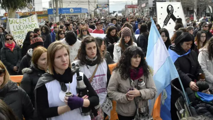 Allí, la manifestación se detuvo durante varios minutos y después continuó por calle Belgrano hasta la puerta del Municipio donde se realizó una nueva parada, esta vez más larga, y en un momento los manifestantes comenzaron a aplaudir, la única vez a lo largo de toda la marcha. Luego de dar una vuelta a la plaza San Martín, la multitudinaria marcha bajó por 28 de Julio hasta regresar a la Galesa. Allí se conformó una gran ronda y los docentes, estudiantes y vecinos en general entonaron el Himno Nacional Argentino, para luego permanecer en silencio durante un largo rato hasta la desconcentración.