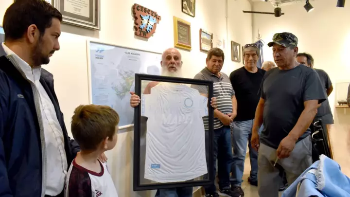 La peña del Club Lanús en Puerto Madryn decidió hacer un homenaje especial a los veteranos de Malvinas de la ciudad: el regalo de una camiseta granate con el logo de las islas.