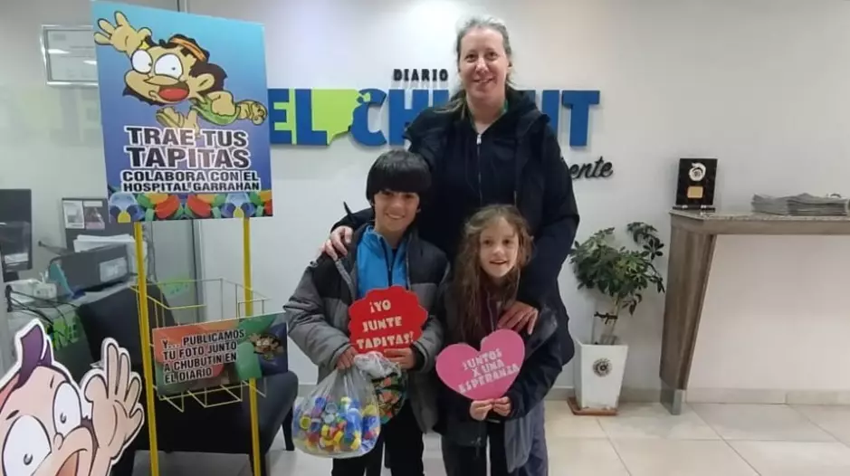 Elias y Eliana Foldes se acercaron a la agencia de Puerto Madryn de diario EL CHUBUT, junto a su mamá Jessica y dejaron tapita aspara colaborar con la campaña en beneficio de la Fundación Garrahan.