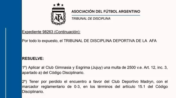 «El Tribunal RESUELVE tener por perdido el encuentro a favor del Club Deportivo Madryn, con el marcador reglamentario de 0-3», dictaminó.