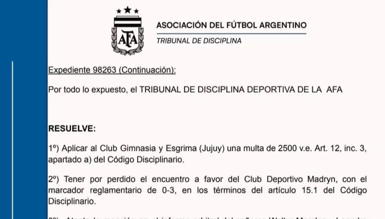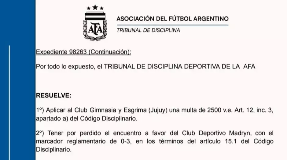 El Tribunal de Disciplina de la AFA, en su Sesión del día de ayer, emitió su decisión final en el Expediente 98263 respecto al partido de ida por los 8vos de final del Reducido de Primera Nacional entre Gimnasia y Esgrima de Jujuy y Deportivo Madryn, suspendido el 19 de octubre.