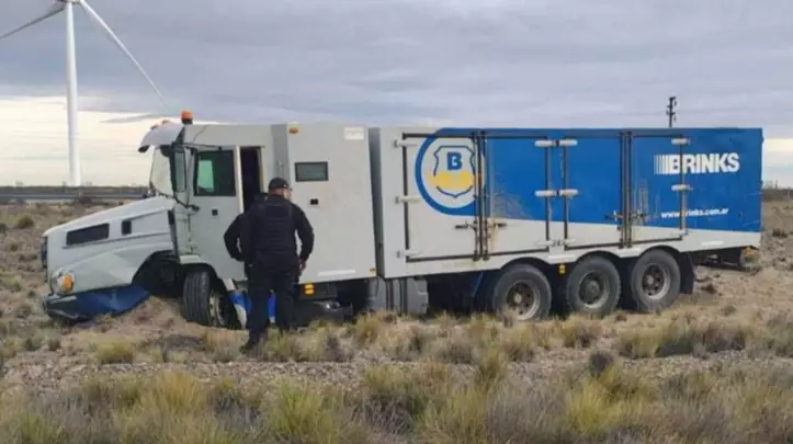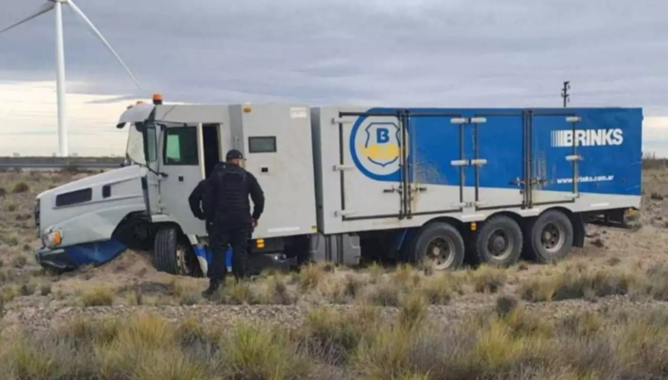 Se trata de un camión de caudales de la empresa Brinks Argentina, que tras un desperfecto mecánico despistó sobre la Ruta N° 3 y quedó encajado en la banquina, cuando se dirigía desde Puerto Madryn hacia Caleta Olivia.