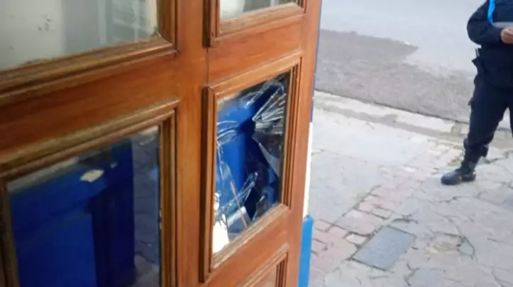 Al acercarse a la puerta, observó a un sujeto que le propinó un golpe de puño al cristal de la puerta de ingreso, lo que provocó la rotura del mismo y un corte superficial en su mano izquierda.