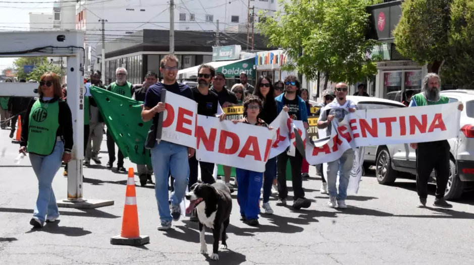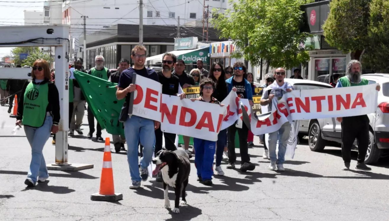 Una segunda columna de trabajadores estatales pertenecientes al Cenpat-Conicet se concentro en el momento a “La galesa”, avenida Roca y Belgrano, bajo el lema “Defendamos la Ciencia Argentina”; partieron y se encontraron con el resto de los manifestantes en la rotonda del muelle Piedra Buena, para dirigirse todos juntos a la delegación.