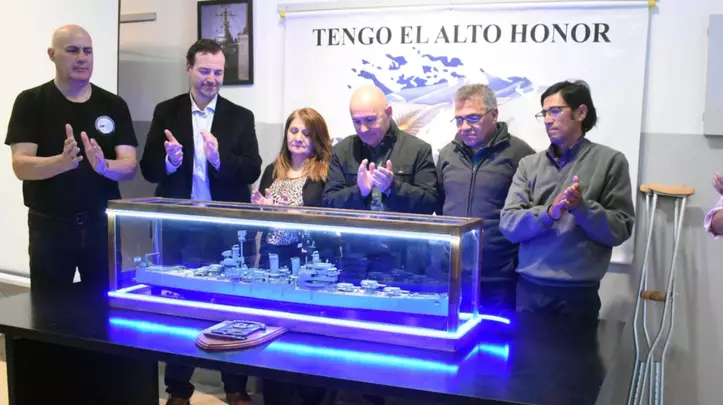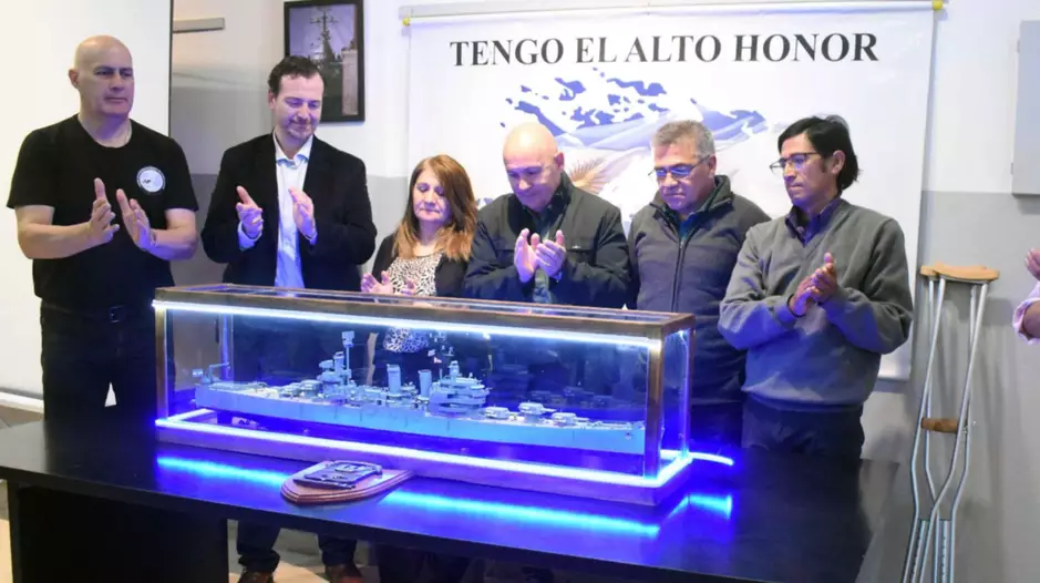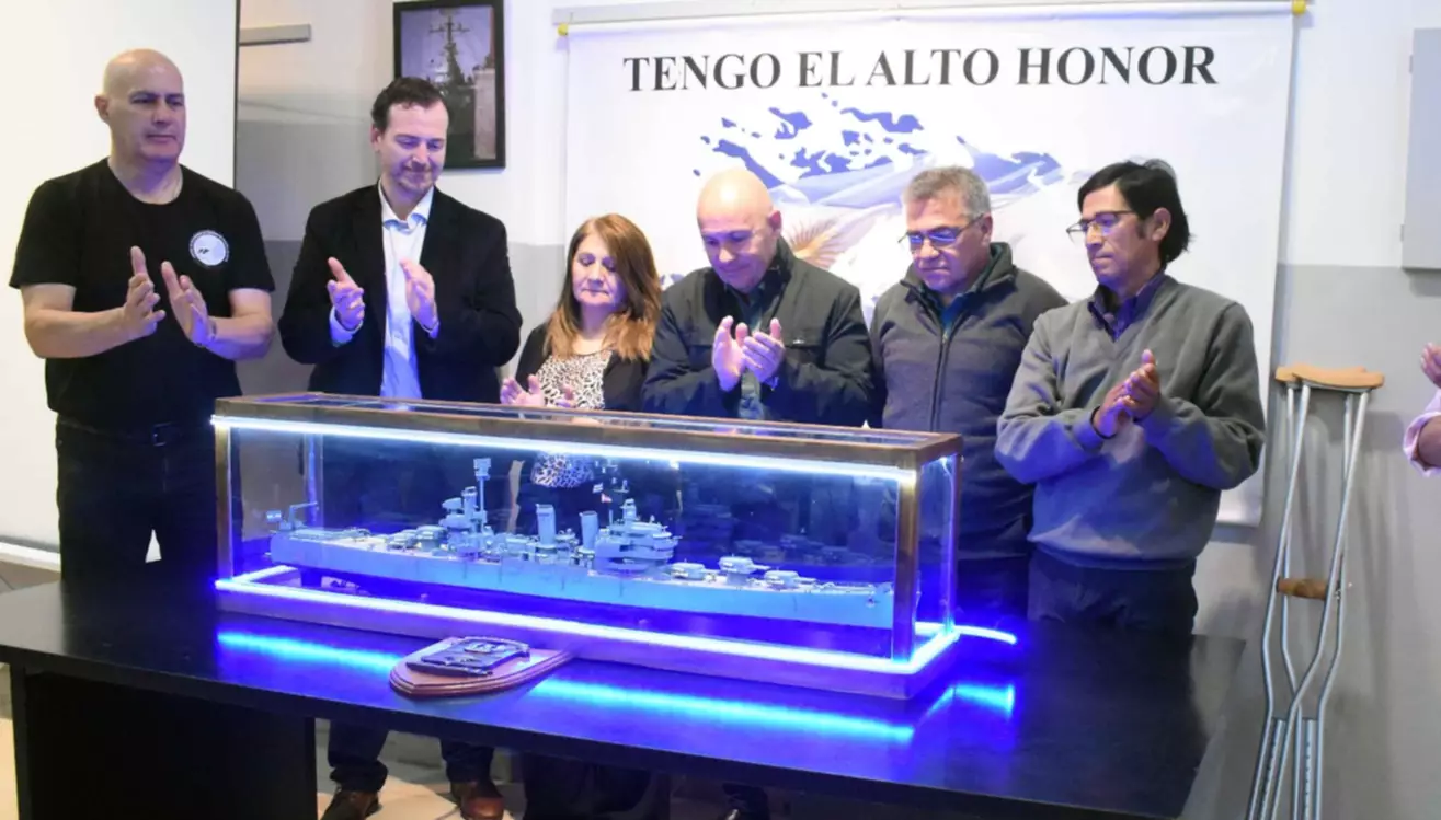 La nueva maqueta terminada por Santiago Pereira del Crucero ARA Belgrano se descubrió la semana pasada en un acto con la presencia de familiares de víctimas, el intendente, y ex veteranos madrynenses.