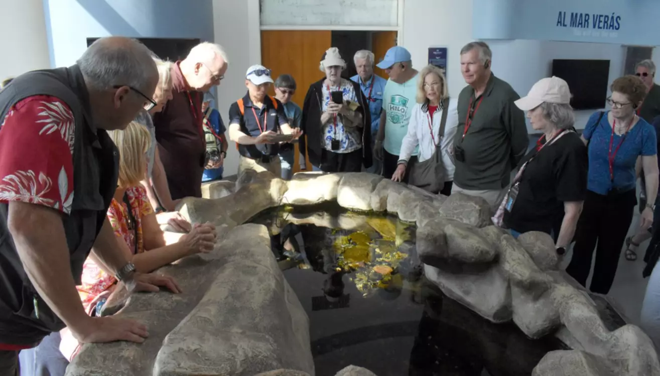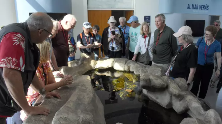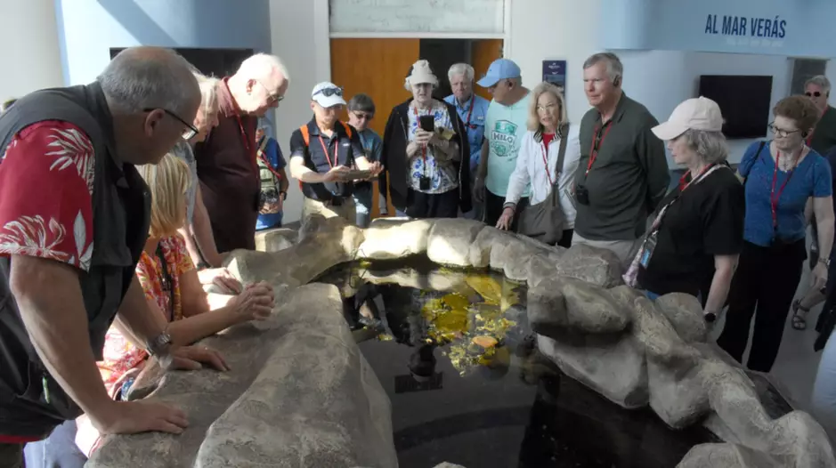 Dentro de los puntos visitados estuvo el Ecocentro Puerto Madryn, que recibió a un gran grupo de cruceristas que recorrió las instalaciones y muestras del espacio, que además hoy inauguró una sala sobre aves marinas del parque provincial Patagonia azul.