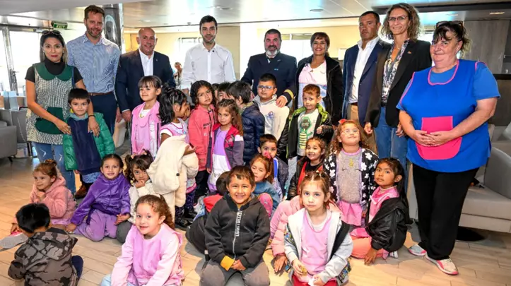 La jornada fue organizada por la agencia marítima Delver como parte del 30° aniversario de la Administración Portuaria de Puerto Madryn (APPM). Durante el recorrido, el titular del Ejecutivo chubutense acompañó a los niños por los diferentes espacios públicos de la embarcación de bandera francesa que arribó este miércoles con 122 pasajeros y 157 tripulantes.