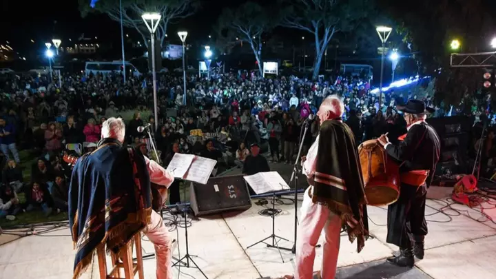 Cerca de la medianoche, la presentación de Los Hermanos Caffaro, llegados desde Córdoba, marcó el cierre musical del evento. A la hora señalada, la multitud en silencio se preparó para uno de los momentos más conmovedores de la noche: con la interpretación de Esteban Ernalz, se entonaron las estrofas del Himno Nacional Argentino y la Marcha de Malvinas, acompañadas por un aplauso cerrado y miradas cargadas de emoción.