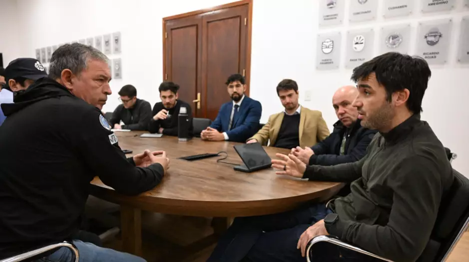 Participaron de la reunión, desarrollada en la Sala de Situación de la Casa de Gobierno, los secretarios de Pesca, Andrés Arbeletche, y de Trabajo, Nicolás Zárate; el intendente de Puerto Madryn, Gustavo Sastre; el secretario general del SOMU en la Región Patagonia, César Zapata, y el referente gremial Mario “Tito” Valenzuela.