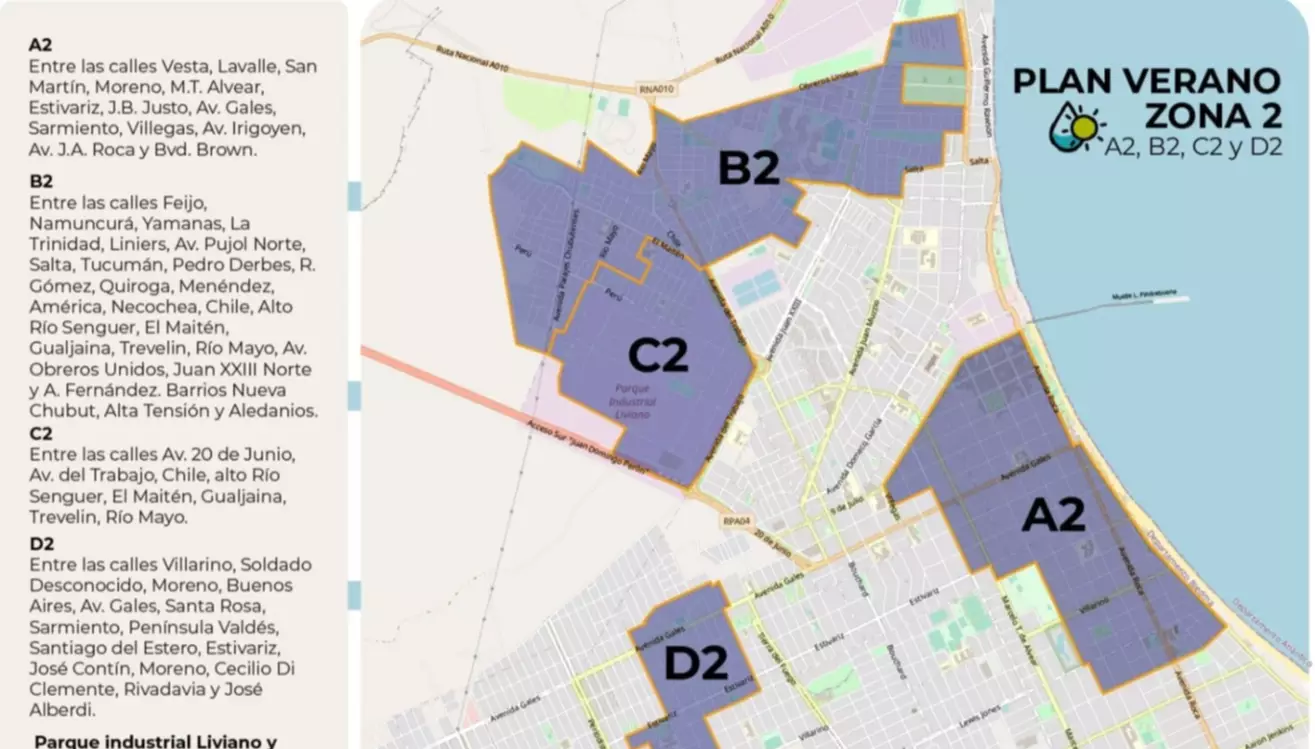 El abastecimiento se verá interrumpido hasta las 24:00 de hoy. Se recuerda que la zona 2 está dividida en sectores (A2 – B2 – C2 – D2) y abarca también los parques: industrial liviano y agroindustrial.