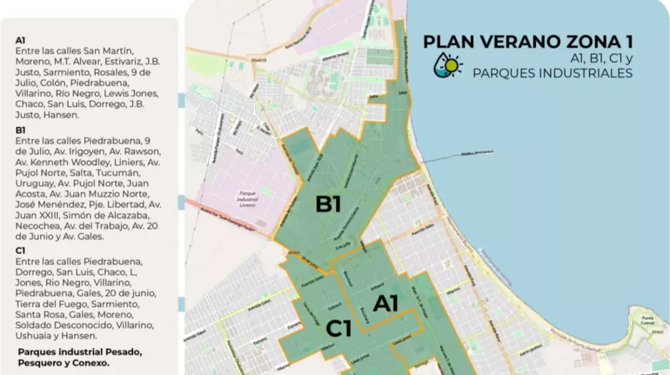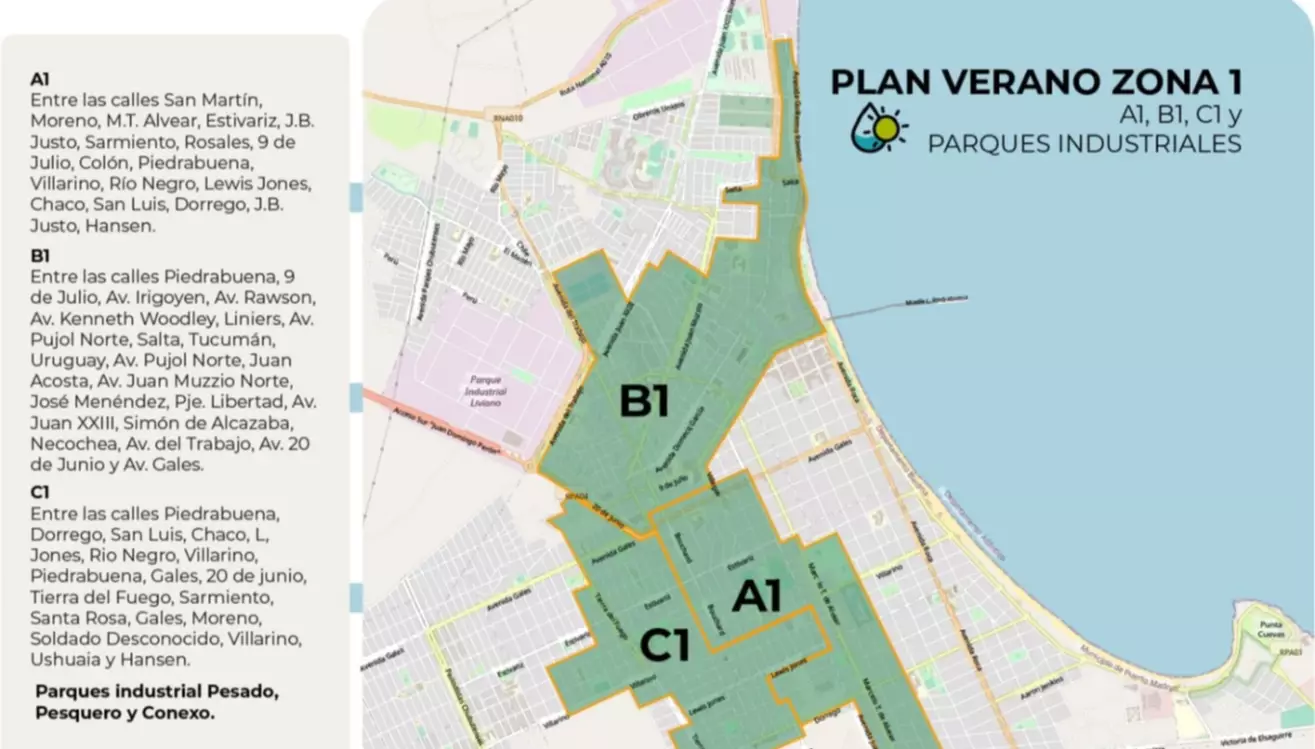 Servicoop informó que hoy continúa el cronograma de cortes con la zona 1. El abastecimiento se verá interrumpido hasta las 24:00 horas. Cabe recordar que la zona 1 está dividida en sectores (A1 – B1 – C1) incluyendo también a los parques: Industrial, Conexo y Pesquero.
