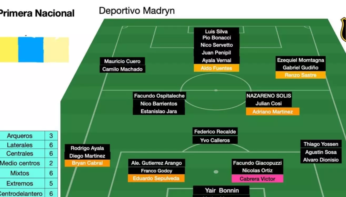 Madryn sostiene la base del equipo que jugó dos finales por el ascenso. Esa continuidad explica por qué, al menos en el inicio del torneo, no se esperan grandes retoques defensivos. La mayor competencia aparece del medio hacia adelante, donde Madryn perdió piezas claves (Bruno Pérez, Diego Crego y Germán Rivero ya no están). El esquema predilecto del entrenador aurinegro es el 4-3-3, aunque el propio Diaz admite que dependerá del rival y del contexto. Con ese dibujo como referencia, el once inicial empieza a tomar forma.