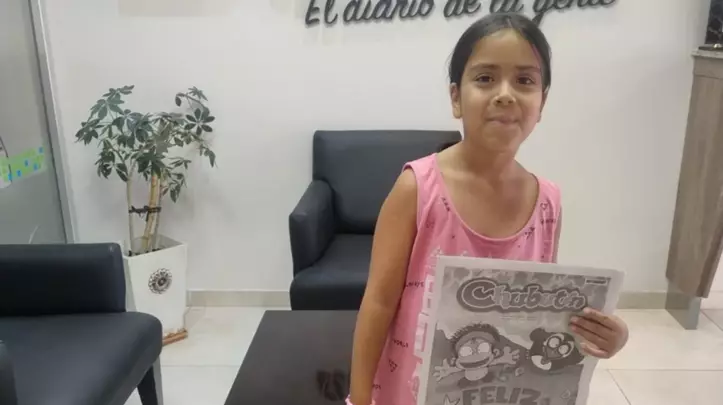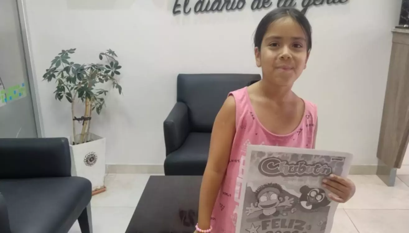 La niña Jazmin Bugueño de ocho años vino a la agencia de EL CHUBUT, acompañada por sus abuelos, para dejar una botella llena de tapitas para colaborar con el Garrahan.