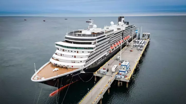 La embarcación, de 285 metros de eslora y bandera de Holanda, amarró minutos antes de las 8 de la mañana sobre la margen norte del Muelle Comandante Luis Piedra Buena, procedente de las Islas Malvinas. A bordo transporta 1.904 pasajeros y 791 tripulantes, quienes durante la jornada pueden recorrer la ciudad y disfrutar de los atractivos turísticos y la oferta de servicios de la Comarca VIRCh-Valdés.