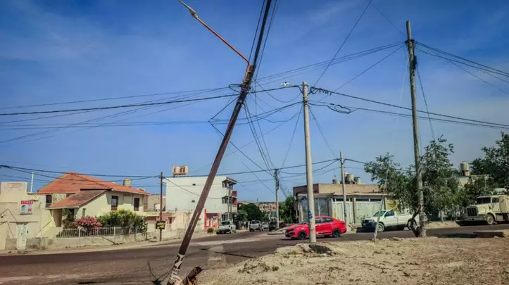 Debido al gran impacto, el poste de madera se quebró y quedó colgado sobre la calle. Personal de Servicoop se hizo presente en el lugar para realizar el recambio del poste afectado y trabajar en la normalización del tendido eléctrico.