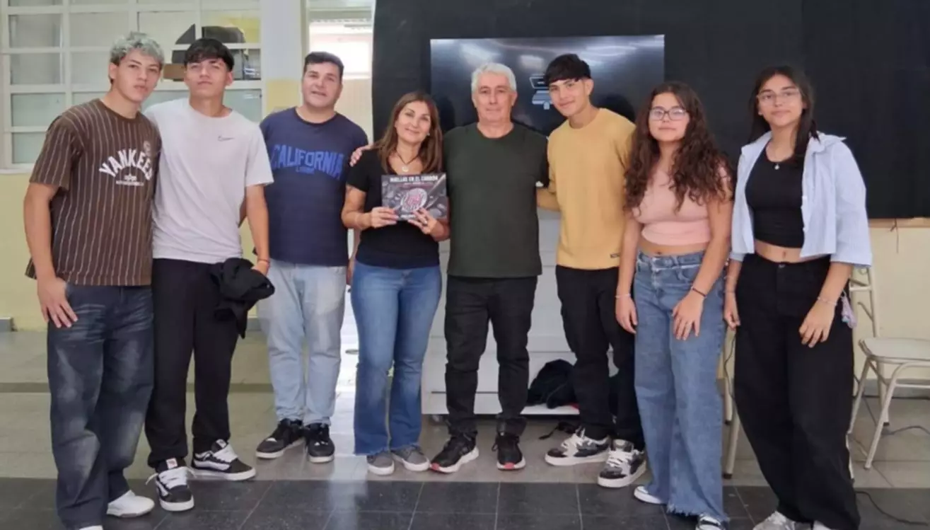 Al finalizar el encuentro el autor del libro hizo entrega a la directora Cecilia Pérez de un ejemplar de «Huellas de Carbón» destinado a la biblioteca de la escuela.
